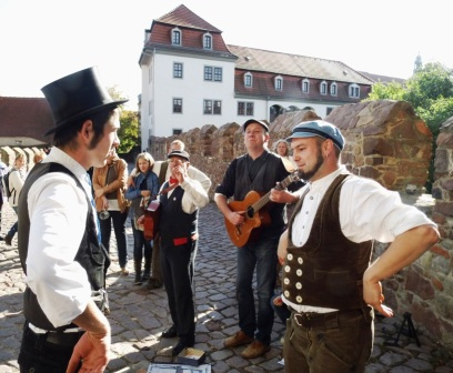Für uns besonders schön: die Begegnung mit einem fahrenden Gesellen aus Hamburg (im Bild links), der mit seinen einheimischen Brüdern uns und dem Publikum gezeigt hat, wie man das "Kassler Verschüttlied" oder den "Man mit dem Hut" richtig schallert.