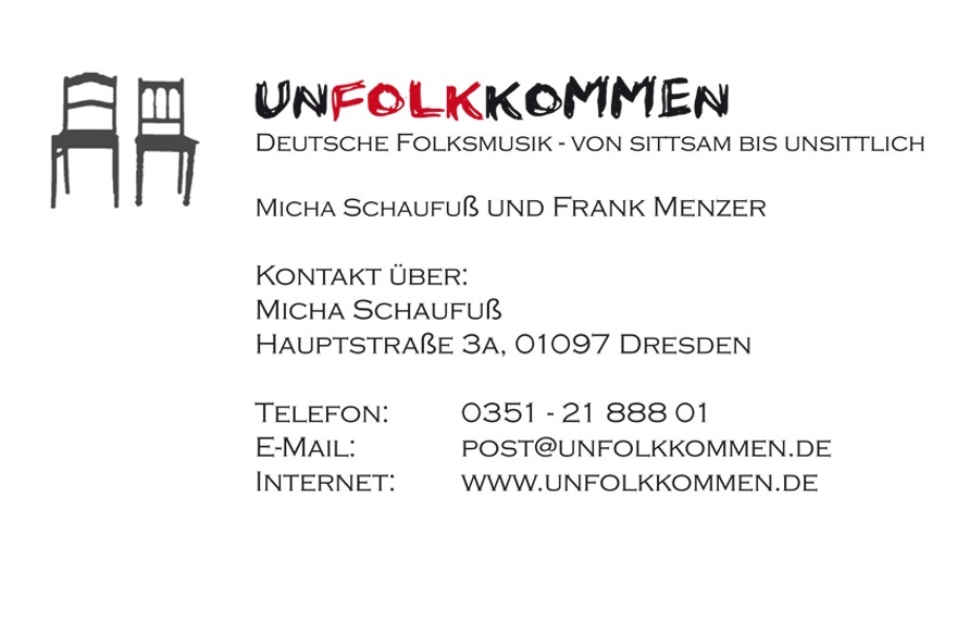 Kontakt Micha Schaufuß und Frank Menzer Kontakt über: Micha Schaufuß Hauptstraße 3a, 01097 Dresden Telefon: 0351 - 21 888 01 E-Mail: post[at]unfolkkommen.de