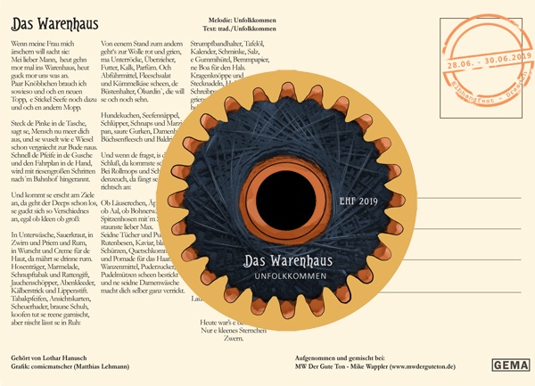 Natürlich gibt´s auch in diesem Jahr wieder eine Mini-CD in unserer Reihe "Säggs'sche Miniaturen". Wir hatten vor einiger Zeit aus dem Publikum einen wunderbaren Liedtext mit zeitlosem Inhalt ("Das Warenhaus") bekommen, den aber mangels überlieferter Melodie erstmal beiseite gepackt. Nun ist der Text aber so schön, dass wir unbedingt ein Lied haben wollten.