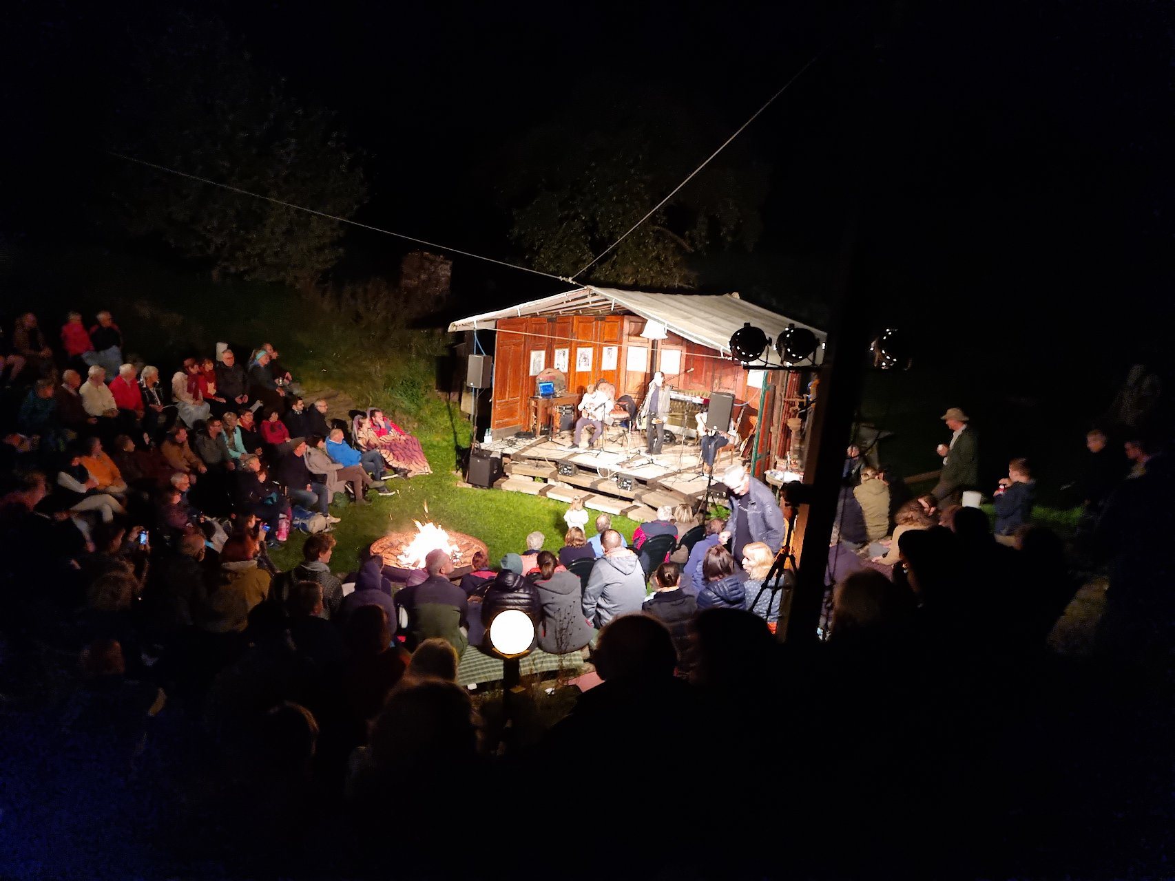 Das Programm war facettenreich und wir durften den Abend starten. Es folgten die Kollegen von Bube Dame König und hernach von Hüsch! und zum Abschluss gab´s drei gemeinsame Zugaben. Das Publikum war umwerfend und die ganze Atmosphäre einfach nur Klasse. Später sammelten sich die Unermüdlichen an der großen Feuerschale und musizierten und sangen bis spät in die laue Herbstnacht hinein...