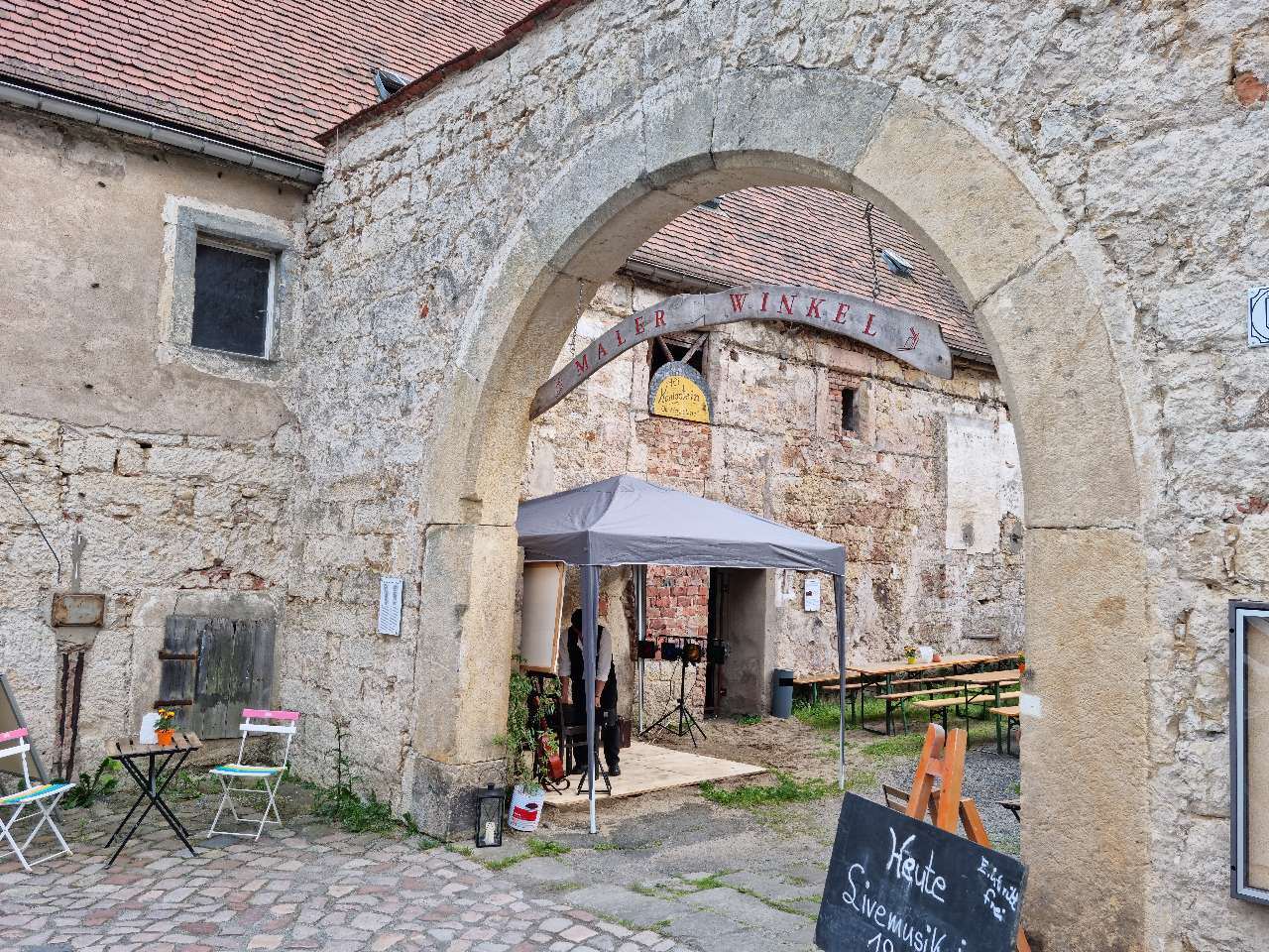 Am Sonntag waren wir im Malerwinkel in Königstein verabredet. Ein zauberhafter alter Ort, um den sich rührige Zeitgenossen kümmern und am Leben erhalten. Das Publikum wunderbar gemischt: Hiesige, die der Veranstaltung wegen kamen, eine Wandergruppe aus Bayern, die eigentlich ihren Zug schaffen wollte und dann doch hängen blieb und Pfingsttouristen, die zufällig am Winkel vorbei und schließlich rein kamen. Wider Erwarten volle Hütte. Petrus hatte seinen Segen erteilt und nur der Abgesang war von einigen Regentropfen begleitet.