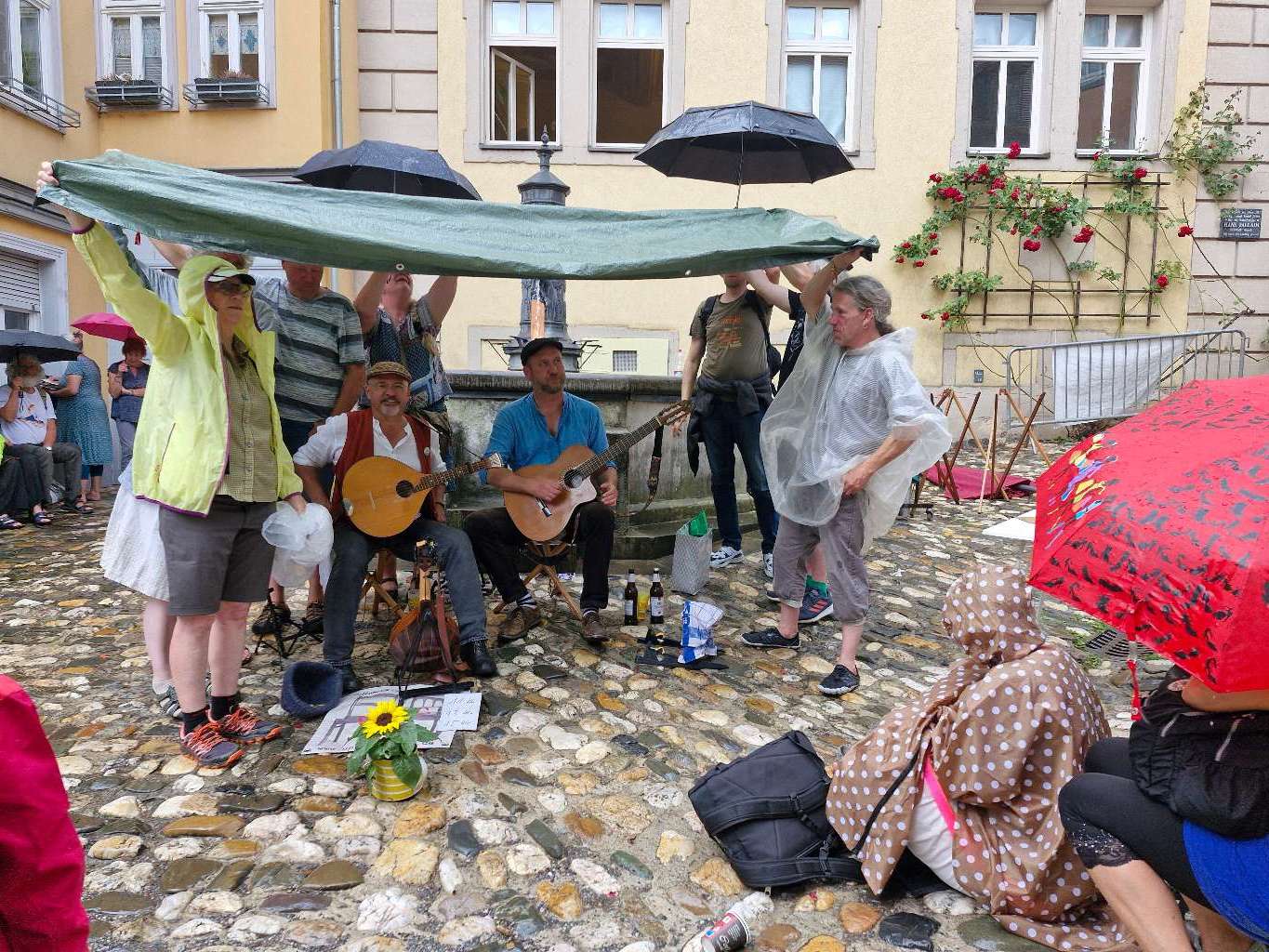 Kurzzeitig drehte Petrus die Wasserrohre auf und eigentlich wäre hier Schluß für Straßenmusik. Nicht bei UNFOLKKOMMEN. Eine große Baumarktplane, sechs wackere Leute und fertig ist die überdachte Brunnenbühne. Perfekter Spaß!