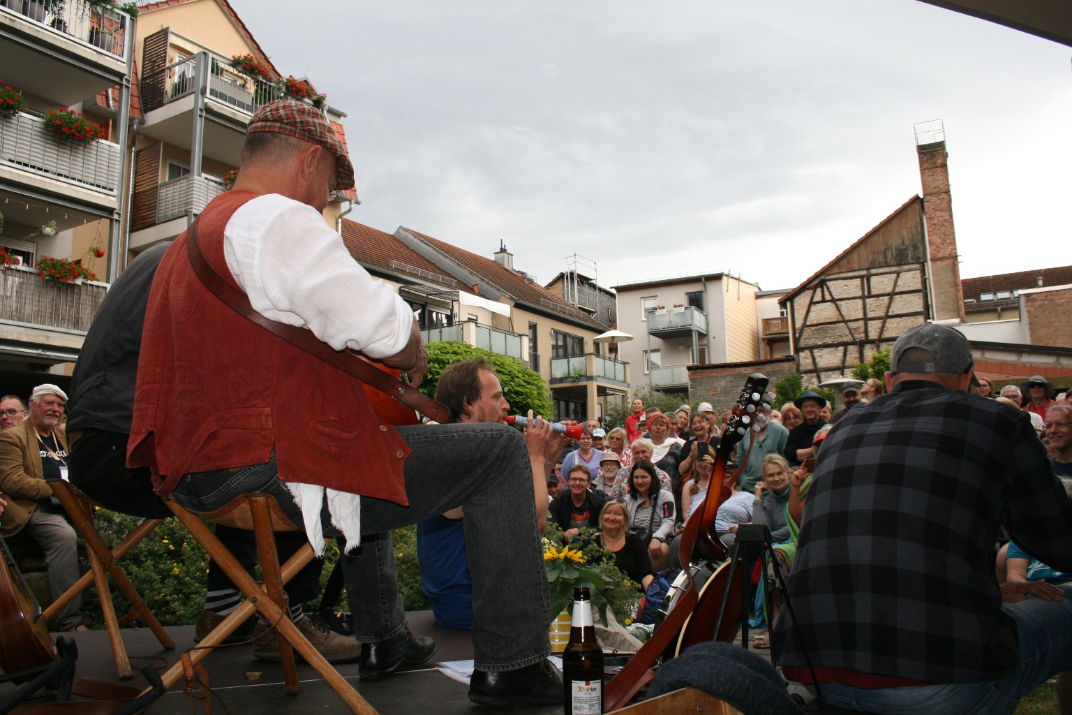 Die beiden offiziellen Konzerte waren derart gut besucht, dass die Höfe drohten, aus den Nähten zu platzten und wir an unsere akustischen Grenzen stießen. Die Forderung nach verstärkter Musik ist in solchen Situationen durchaus nachvollziehbar, dennoch wollen wir unserem Motto treu bleiben: Folksmusik muss ohne Strom und Kabel auskommen können. Da hilft nur, näher ranzurücken. Dank toller Gastgeber und einem wunderbaren Publikum hat das auch gut funktioniert.