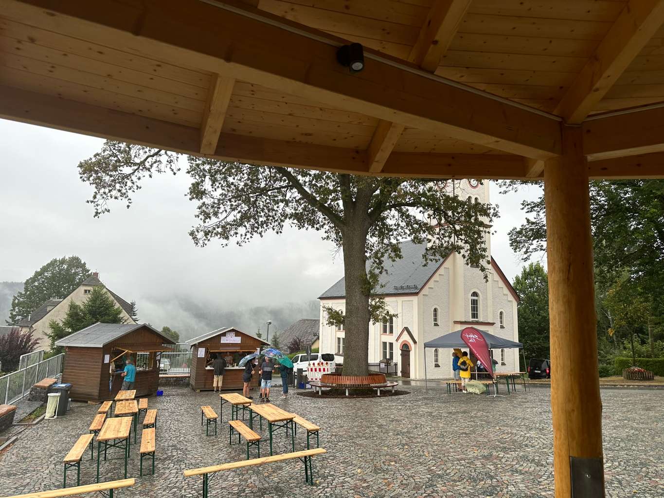 Wir hatten Glück. Unsere Station befand sich unmittelbar am zentralen Festplatz von Witzschendorf, den emsige Handwerker nur wenige Tage zuvor fertiggestellt hatten. Da gab es für unsere Kollegen von den "Erzgesellen" (tolle Kollegen!) und uns eine wunderbare kleine Bühne und fürs Publikum gute Versorgung mit Speis und Trank. Als der Wolkenbruch dann auch die letzten regenbeschirmten Unverdrossenen vertreiben wollte, sind wir kurzerhand mitsamt Publikum in die nahe Kirche umgezogen.