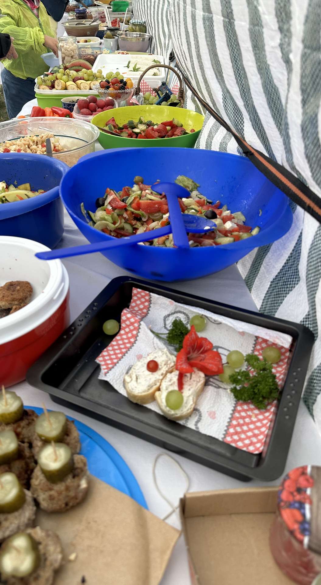 Aber es kam alles ganz anders: Der Regen hörte auf und die dunklen Wolken verzogen sich. Und auf einmal kamen auch die Besucher und binnen einer halben Stunde waren selbst die Reserve-Gartentische aufgestellt und alle Plätze vergeben. Die Gastgeber hatten um Spenden fürs Buffet gebeten und die Besucher ließen sich nicht lumpen. Einen besseren Brunch findet man in keinem Restaurant!