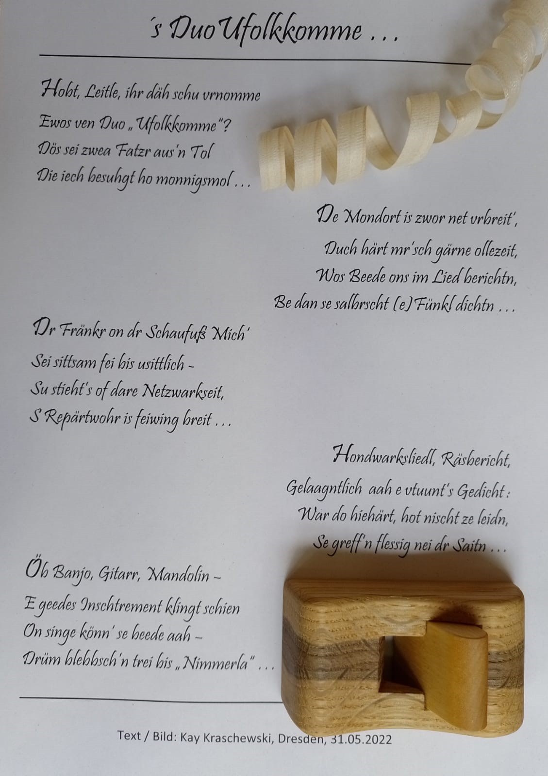 während des diesjährigen Elbhangfestes haben wir einige eurer Lieder gehört und waren sehr angetan von der Frische, die Ihr ausstrahlt. Es kommt nicht allzu oft vor, dass zwei Talente dieser Art sich zusammenfinden und so ergänzen. Eure Texte mit Augenzwinkern, gewürzt mit viel Witz und Ironie, passen gut in unsere Zeit. Ganz im Sinne des namhaften Komponisten, dessen 200. Geburtstag wir in diesem Jahr feiern, habt Ihr "den Leuten aufs Maul geschaut". Man hört, dass Ihr Freude am Musizieren habt. Macht weiter so! Es gibt noch viele musikalische Schätze zu heben - auch "unvolkkommene". Wir freuen uns auf ein Wiedersehen und -hören beim 13. Kirnitzschtalfest.