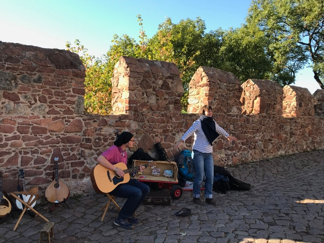 Also haben wir ersatzweise zwei spätsommerlich-frühherbstliche Nachmittage auf der Burgbrücke aufgespielt. Um es vorweg zu nehmen: Publikum und Resonanz waren grandios. Selbst die Tatsache, dass der berühmte Fahrstuhl am Burgberg (pünktlich und wieder einmal) ausgefallen ist und der (für bequeme Zeitgenossen) eingerichtete Shuttle für stete Publikumsbeschäftigung sorgte, konnte dem schönen Wochenende keinen Abbruch tun.