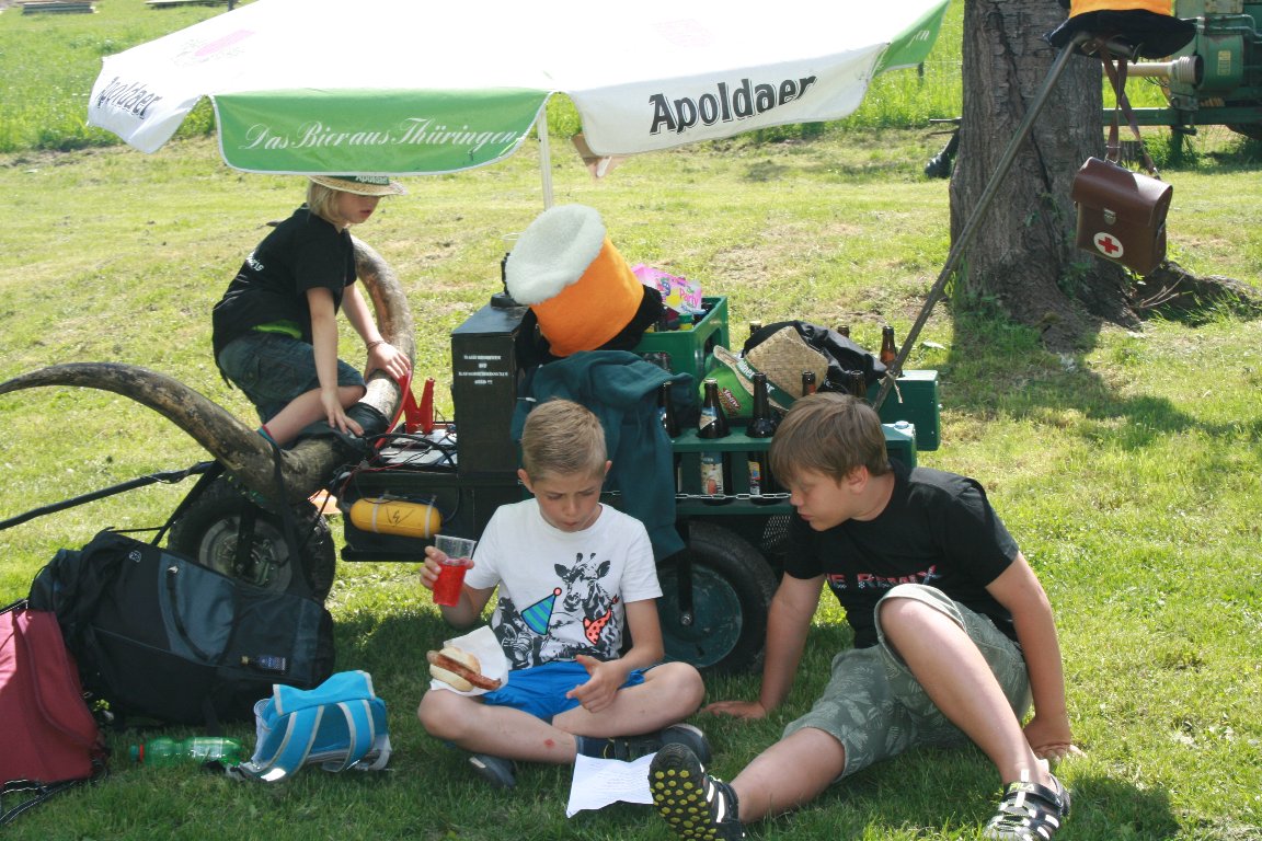 Was aber nach der Anfahrt mit dem Auto und dem sichtbaren Ausmaß unseres Planes gleich am Anfang mittels Vetorechts verhindert wurde. Nun waren wir aber schonmal da und bollerten pünktlich 10 Uhr zunächst Richtung Vorwerk. Außer einem einsamen DJ waren dort aber keine Menschen. Hingegen lockten vom anderen Ufer aus der Linkenmühle fröhliche Klänge und so setzten wir kurzerhand mit der Fähre über. Die fröhlichen Klänge entpuppten sich bei näherem Hinsehen und -hören als Druckbespaßung einer Einmann-Unterhaltung. Fazit: Auch nichts für uns. Also nur ein Startbier und zurück ins Vorwerk, wo nun doch schon frühe Himmelsfahrer den schönen Biergarten besetzt hatten. Ein Gulasch brodelte im Kessel und der Bräter verbreitete seinen unwiderstehlichen Duft. Jetzt war das doch ein schöner Platz zum Musizieren. Als dann die Jungs (und mittlerweile sogar kleinen Mädels) von der Weimarer Biersekte aufkreuzten war der Spaß perfekt.