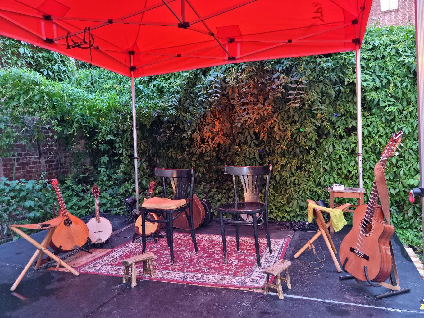 Unser Konzert am Sonnabend sollte das Festival beschließen, es gab zahlreiche Voranmeldungen und der Innenhof der KUMA füllte sich zusehends. Im gleichen Takt zogen aber auch schwarze Wolken am Himmel auf und Plan B für den Umzug in den Saal wurde eine realistische Option. Auf technische Verstärkung haben wir nach kurzer Beratung mit Thomas Strauch dann bewust verzichtet, denn die Akustik im alten Fabrikhof war einfach klasse. Nach drei Titeln dann machte Petrus ernst und wir mussten samt Instrumenten und Publikum ins Innere umziehen. Alles sehr entspannt und irgendwie auch lustig. Mit Wohnzimmer-Stehlampe und passendem Teppich war flugs auch ein heimeliges Ambiente geschaffen und wir konnten loslegen. Dass wir am Ende fast drei Stunden musiziert haben war in erster Linie dem tollen Publikum zu verdanken.