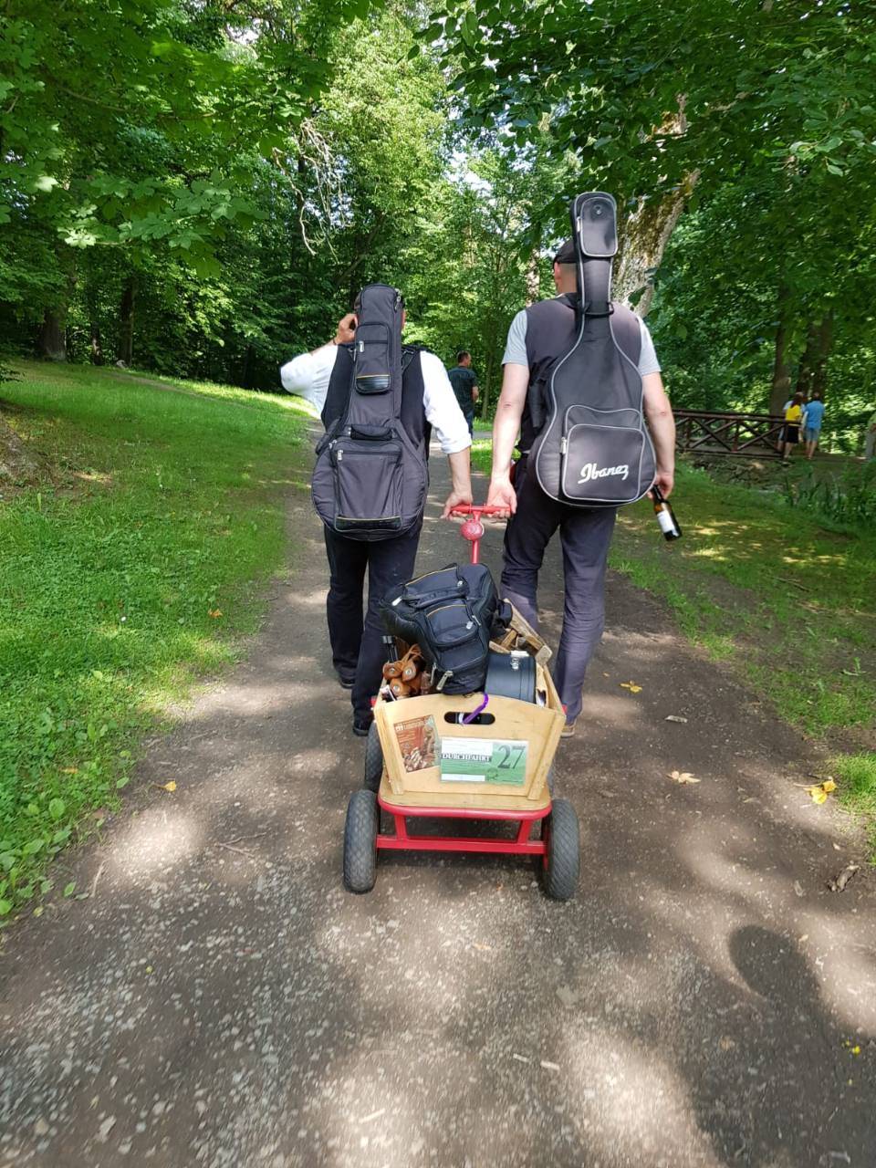 Allerdings war der Start zunächst etwas holprig: Unser Bollerwagen hatte einen Reifenplatzer, der mit lautem Knall die Beschaulichkeit des Parks durchbrach. Uns ist ja schon allerhand widerfahren, aber sowas noch nie! Fischelant wie der gelernte Ossi so ist, haben fleißige Helfer sofort einen Radwechsel vorgenommen und den Übeltäter provisorisch mit Papier gefüllt. Unglaublich, aber das hat gehalten...