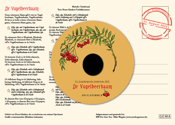 2022 nun unsere "Säggs´sche Miniatur Nr.13". Ein Lied, das wir 2019 in der Hirtsteinbaude von Horst Günther gehört hatten. Viele werden erstmal gähnen: Der Vugelbeerbaam ist hierzulande nun wirklich hoch, runter und wieder zurück gesungen worden. Die Fassung vom Horscht (der hat den Text wiederum von seinem Opa und der Horscht ist auch schon etwas älter ;-) ist mal was ganz anderes und wir fanden, das gehört sich glatt weitergesungen!