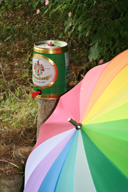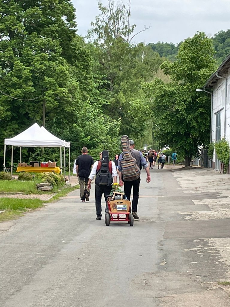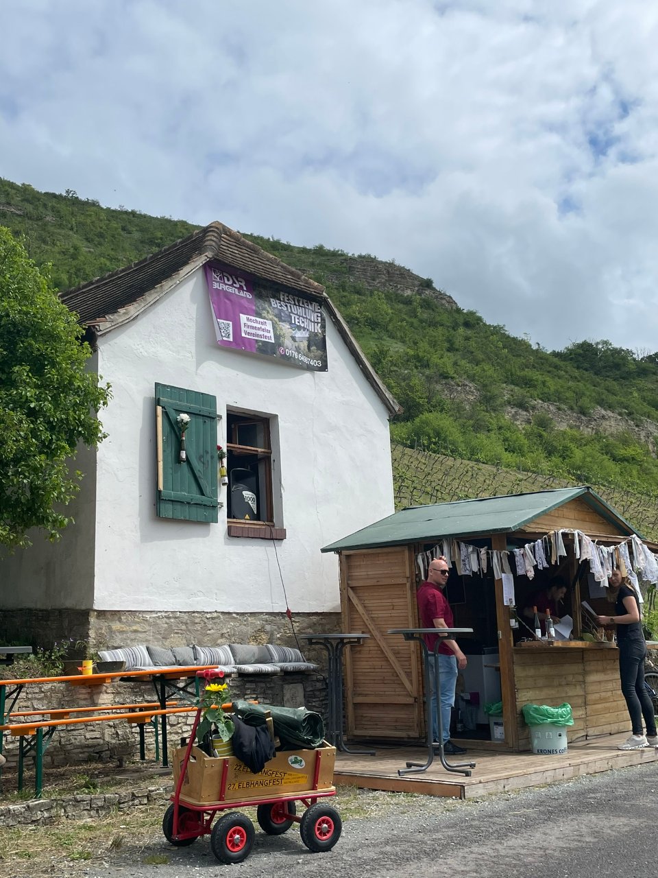 Nach einer kleinen Starthilfe kamen wir samt Bollerwagen und Sonnenblume "Klara" an unserem geliebten alten Weinberghäuschen vorm Göttersitz an und mussten mit Entsetzen feststellen, dass nun auch noch der letzte Ort der Abwesenheit von Strom & Kabel soundtechnisch erschlossen werden konnte. Einem mobilen Stromaggregat sei Dank! Aus dem Fenster des kleinen Häuschens drönte eine Soundbox und ein Verkaufszelt versprach Partyflair und lustige Getränke. Da blieb nun wirklich kein Raum mehr für unsere Straßenmusik-Bühne.
