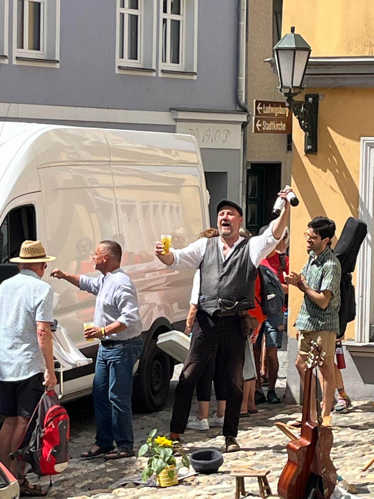 In diesem Jahr kam es anders, weil am Freitagabend irgendein gummibereifter Heißsporn zwei Festivalgästen über die Füße fahren musste... Die Folge: Verständliche Panik bei Behörde, Org-Büro und Security. Nun hieß es nicht mehr "Gasse bilden", sondern die Gasse musste per se frei sein. Das kriegen selbst wir und unser Stammpublikum nicht hin, da es leider immer wieder solche Festivalbesucher gibt, die meinen, mit dem Ticket auch die Rudolstädter Straßen erworben zu haben und eben auf ihrem Hocker einfach sitzen bleiben, wenn da ein böses Auto kommt. Nun denn.