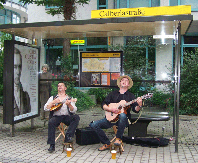 Die mit Abstand schönste Bühne hatten wir im Buswartehäuschen "Calberlastraße": Trockene Instrumente trotz Regen, gute Akustik und ein famoses Publikum. |